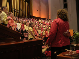 In December of 2008 I received a call to serve as the Choir Manager for the YW choir that would sing at the General Young Women's Meeting on March 28, 2009. My responsibilities were to "manage" 364 young women from 10 stakes in the Salt Lake Area who would be participating in the choir. I had the opportunity to meet and work with wonderful people who helped with the choir. There were many tender mercies along the way. Les was amazing as supported me and took care of everything at home so I could complete this assignment. It was a full time job for several months. It was a life changing experience. I wish I had more pictures but here are a few from the dress rehearsal and final practice before the performance.